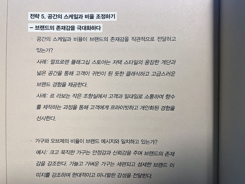 이 책에서 가장 설득력 있었던 점은 공간을 종합적 경험의 장으로 바라보는 시각입니다. 제품이나 서비스 자체의 경쟁력만큼이나, 그 경험이 어디서 어떻게 전달되는지가 브랜드의 성패를 좌우한다는 점은 직접적인 체감으로 이어집니다.