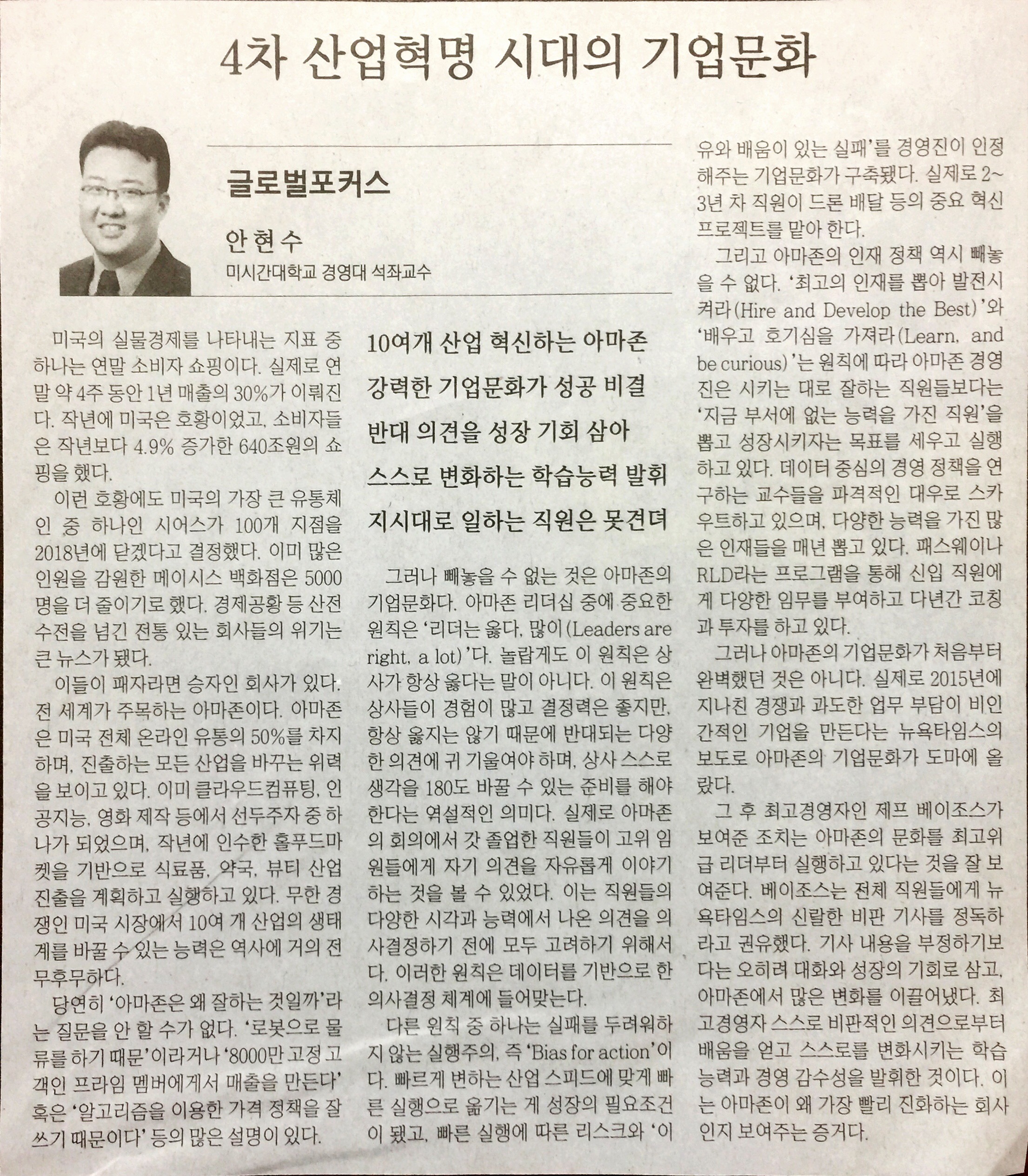 4차 산업혁명 시대의 기업문화 : 매일경제 글로벌포커스 (2018년 1월 16일 화요일) Posted on 2018-01-282019-01-06 by amagrammer 4차 산업혁명 시대의 기업문화 안현수 미시간대학교 경영대 석좌교수 10여개 산업 혁신하는 아마존 강력한 기업문화가 성공 비결 반대 의견... Read More