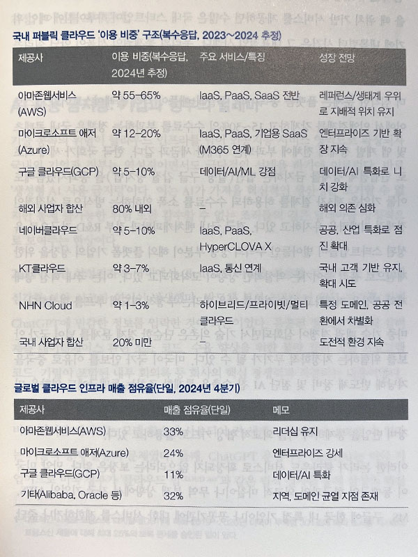 결국 우리의 소중한 벤처 자본과 정부 R&D 자금이 국내 혁신 생테계를 키우는 대신 아마존, 마이크로소프트, 구글의 성장을 직접적으로 지원하고 기술 격차를 더 벌리는 재투자의 재원이 되는 역설적인 상황이 벌어지고 있다. 이는 국가 혁신 자본이 해외로 유출되어 우리의 경쟁자를 키워주는 결과를 낳는 자멸적인 자금의 흐름이다. 2025년 약 99억 5천 달러 규모로 예상되는 한국 클라우드 컴퓨팅 시장에서 퍼블릭 클라우드가 전체 시장의 66.5%를 차지하며 이 부분에서 해외 하이퍼스케일러들이 주도적인 위치를 차지하고 있다.26쪽